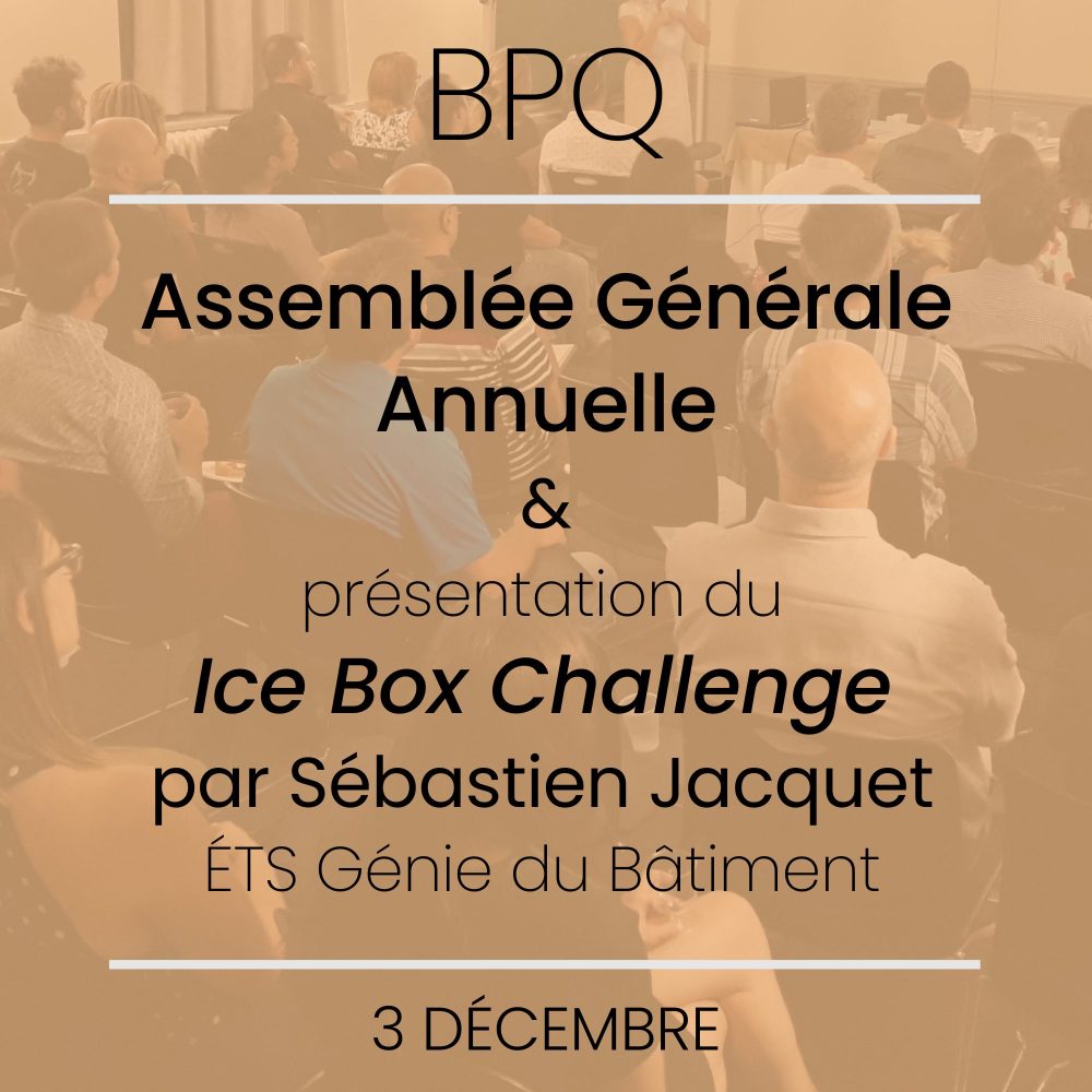 Nous avons également le plaisir de vous informer que l’AGA sera suivie d’une présentation de Sébastien Jacquet, chargé de cours à l’ÉTS en génie de la constrcution et instigateur de la première édition du Ice Box Challenge au Québec ; une leçon d’efficacité énergétique à échelle humaine, rendue visible en plein cœur de Montréal. Ce sera une chance de pouvoir discuter avec lui de ce défi : conserver un bloc de glace de près de 1 000 kg pendant 21 jours, sans climatisation où conception, performance d’isolation et rigueur technique entrent en jeu. Une belle démonstration que l’efficacité énergétique ne sert pas qu’en hiver!